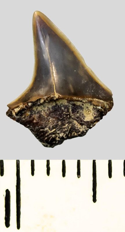 Зуб (фрагмент). Акула. Xyphodolamia sp. Классификация: Хордовые Chordata, Позвоночные Vertebrata, Хрящевые рыбы Chondrichthyes, Пластиножаберные Elasmobranchii