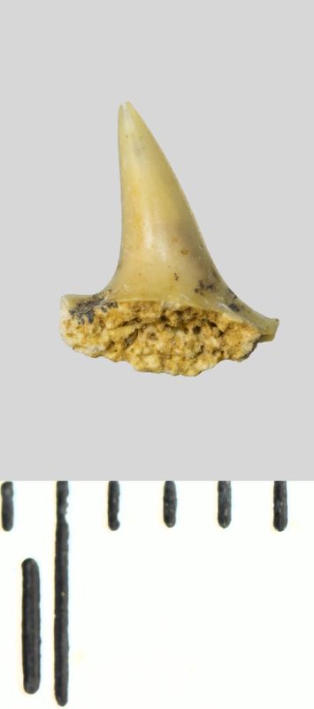 Зуб (фрагмент). Акула. Eostriatolamia sp. Классификация: Хордовые Chordata, Позвоночные Vertebrata, Хрящевые рыбы Chondrichthyes, Пластиножаберные Elasmobranchii