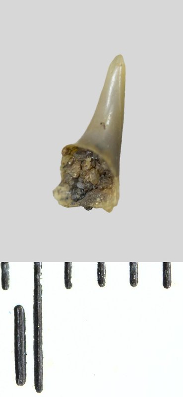 Зуб (фрагмент). Акула. Synechodus sp. Классификация: Хордовые Chordata, Позвоночные Vertebrata, Хрящевые рыбы Chondrichthyes, Пластиножаберные Elasmobranchii