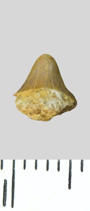 Зуб (фрагмент). Акула. Lamniformes gen. et sp. indet. Классификация: Хордовые Chordata, Позвоночные Vertebrata, Хрящевые рыбы Chondrichthyes, Пластиножаберные Elasmobranchii