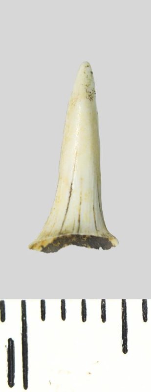 Зуб (фрагмент). Акула. Scapanorhynchus sp. Классификация: Хордовые Chordata, Позвоночные Vertebrata, Хрящевые рыбы Chondrichthyes, Пластиножаберные Elasmobranchii