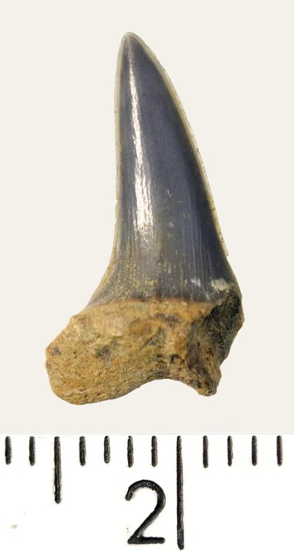 Зуб. Акула. Striatolamia elegans (Agassiz, 1838). Классификация: Хордовые Chordata, Позвоночные Vertebrata, Хрящевые рыбы Chondrichthyes, Пластиножаберные Elasmobranchii