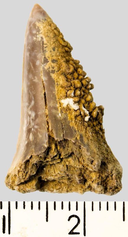 Зуб (фрагмент). Акула. Otodus subserratus (Agassiz, 1843). Классификация: Хордовые Chordata, Позвоночные Vertebrata, Хрящевые рыбы Chondrichthyes, Пластиножаберные Elasmobranchii