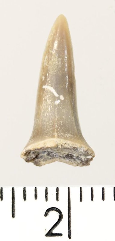 Зуб (фрагмент). Акула. Hypotodus sp. Классификация: Хордовые Chordata, Позвоночные Vertebrata, Хрящевые рыбы Chondrichthyes, Пластиножаберные Elasmobranchii