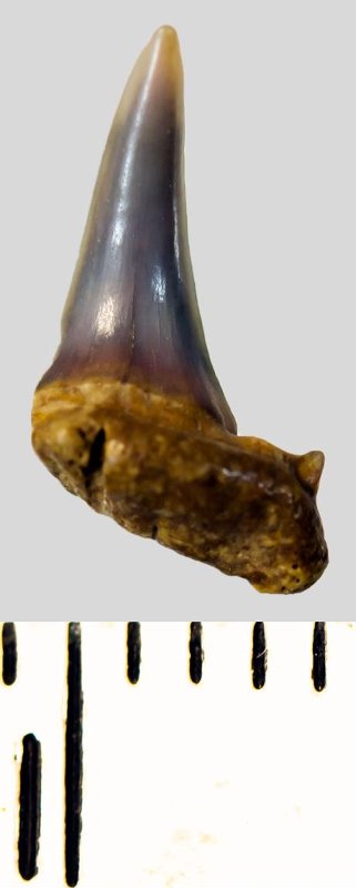 Мелкий боковой зуб с коронкой рыжевато-бежевого цвета, колюще-режущего типа, S-образно изогнутой, с гладким режущим краем. С лингвальной стороны у основания коронки на эмали имеется скульптура в виде слабой продольной струйчатости. Корень бурый, арочный, умеренно массивный, со следами окатанности, левая ветвь утрачена. Имеется одна питательная борозда с лингвальной стороны корня. Добавочные зубцы коронки зуба отсутствуют.