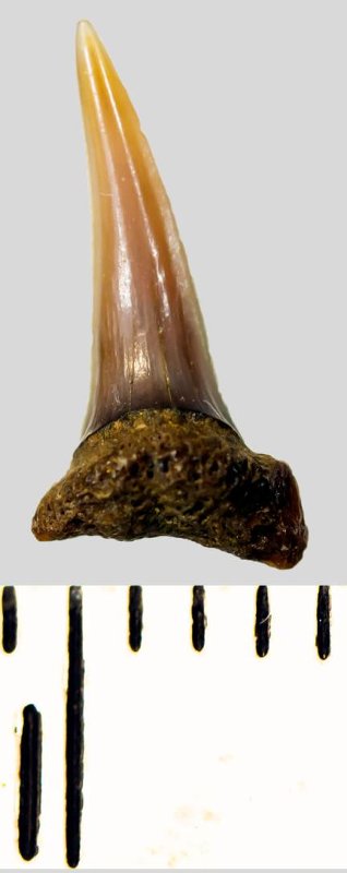 Мелкий боковой зуб с коронкой рыжевато-бежевого цвета, колюще-режущего типа, S-образно изогнутой, с гладким режущим краем. С лингвальной стороны у основания коронки на эмали имеется скульптура в виде слабой продольной струйчатости. Корень бурый, арочный, умеренно массивный, со следами окатанности, левая ветвь утрачена. Имеется одна питательная борозда с лингвальной стороны корня. Добавочные зубцы коронки зуба отсутствуют.