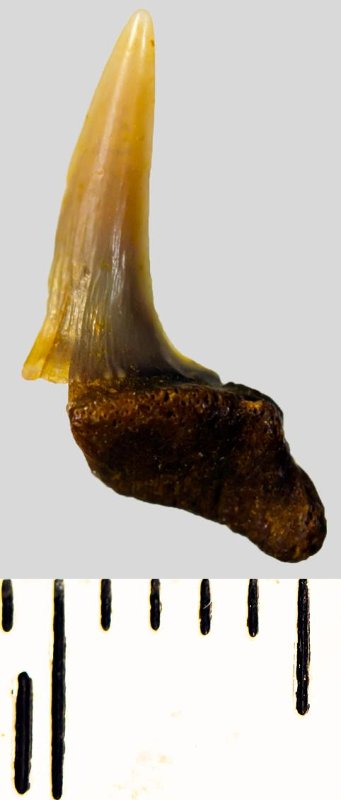 Мелкий боковой зуб с коронкой рыжевато-бежевого цвета, колюще-режущего типа, S-образно изогнутой, с гладким режущим краем. С лингвальной стороны у основания коронки на эмали имеется скульптура в виде слабой продольной струйчатости. Корень бурый, арочный, умеренно массивный, со следами окатанности, левая ветвь утрачена. Имеется одна питательная борозда с лингвальной стороны корня. Добавочные зубцы коронки зуба отсутствуют.