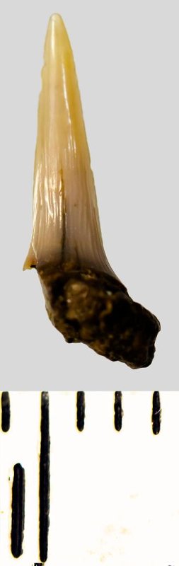Мелкий боковой зуб с коронкой рыжевато-бежевого цвета, колюще-режущего типа, S-образно изогнутой, с гладким режущим краем. С лингвальной стороны у основания коронки на эмали имеется скульптура в виде слабой продольной струйчатости. Корень бурый, арочный, умеренно массивный, со следами окатанности, левая ветвь утрачена. Имеется одна питательная борозда с лингвальной стороны корня. Добавочные зубцы коронки зуба отсутствуют.