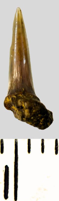 Мелкий боковой зуб с коронкой рыжевато-бежевого цвета, колюще-режущего типа, S-образно изогнутой, с гладким режущим краем. С лингвальной стороны у основания коронки на эмали имеется скульптура в виде слабой продольной струйчатости. Корень бурый, арочный, умеренно массивный, со следами окатанности, левая ветвь утрачена. Имеется одна питательная борозда с лингвальной стороны корня. Добавочные зубцы коронки зуба отсутствуют.