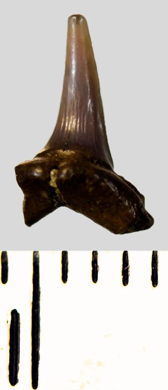 Мелкий боковой зуб с коронкой рыжевато-бежевого цвета, колюще-режущего типа, S-образно изогнутой, с гладким режущим краем. С лингвальной стороны у основания коронки на эмали имеется скульптура в виде слабой продольной струйчатости. Корень бурый, арочный, умеренно массивный, со следами окатанности, левая ветвь утрачена. Имеется одна питательная борозда с лингвальной стороны корня. Добавочные зубцы коронки зуба отсутствуют.