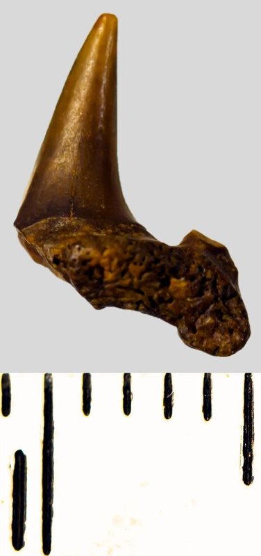 Мелкий боковой зуб с коронкой рыжевато-бежевого цвета, колюще-режущего типа, S-образно изогнутой, с гладким режущим краем. С лингвальной стороны у основания коронки на эмали имеется скульптура в виде слабой продольной струйчатости. Корень бурый, арочный, умеренно массивный, со следами окатанности, левая ветвь утрачена. Имеется одна питательная борозда с лингвальной стороны корня. Добавочные зубцы коронки зуба отсутствуют.