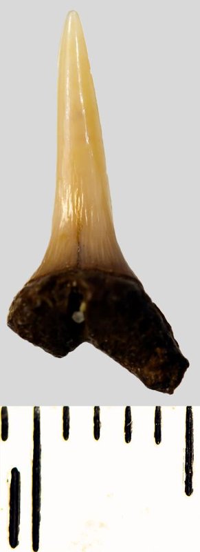 Мелкий боковой зуб с коронкой рыжевато-бежевого цвета, колюще-режущего типа, S-образно изогнутой, с гладким режущим краем. С лингвальной стороны у основания коронки на эмали имеется скульптура в виде слабой продольной струйчатости. Корень бурый, арочный, умеренно массивный, со следами окатанности, левая ветвь утрачена. Имеется одна питательная борозда с лингвальной стороны корня. Добавочные зубцы коронки зуба отсутствуют.