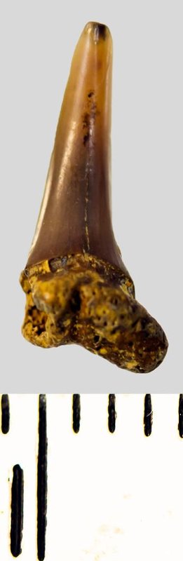Мелкий боковой зуб с коронкой рыжевато-бежевого цвета, колюще-режущего типа, S-образно изогнутой, с гладким режущим краем. С лингвальной стороны у основания коронки на эмали имеется скульптура в виде слабой продольной струйчатости. Корень бурый, арочный, умеренно массивный, со следами окатанности, левая ветвь утрачена. Имеется одна питательная борозда с лингвальной стороны корня. Добавочные зубцы коронки зуба отсутствуют.