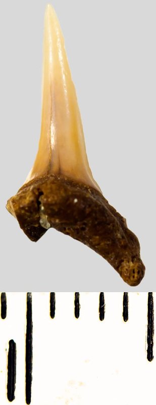 Мелкий боковой зуб с коронкой рыжевато-бежевого цвета, колюще-режущего типа, S-образно изогнутой, с гладким режущим краем. С лингвальной стороны у основания коронки на эмали имеется скульптура в виде слабой продольной струйчатости. Корень бурый, арочный, умеренно массивный, со следами окатанности, левая ветвь утрачена. Имеется одна питательная борозда с лингвальной стороны корня. Добавочные зубцы коронки зуба отсутствуют.