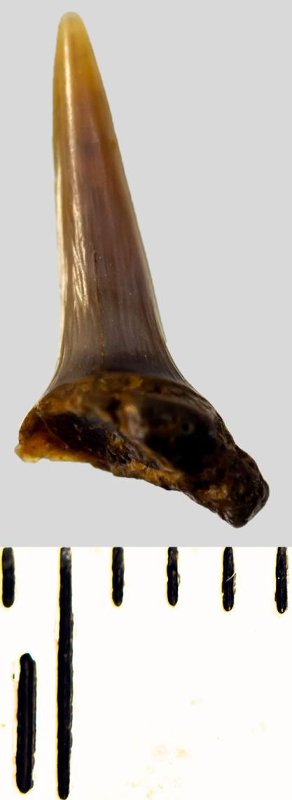 Мелкий боковой зуб с коронкой рыжевато-бежевого цвета, колюще-режущего типа, S-образно изогнутой, с гладким режущим краем. С лингвальной стороны у основания коронки на эмали имеется скульптура в виде слабой продольной струйчатости. Корень бурый, арочный, умеренно массивный, со следами окатанности, левая ветвь утрачена. Имеется одна питательная борозда с лингвальной стороны корня. Добавочные зубцы коронки зуба отсутствуют.