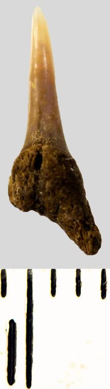 Мелкий боковой зуб с коронкой рыжевато-бежевого цвета, колюще-режущего типа, S-образно изогнутой, с гладким режущим краем. С лингвальной стороны у основания коронки на эмали имеется скульптура в виде слабой продольной струйчатости. Корень бурый, арочный, умеренно массивный, со следами окатанности, левая ветвь утрачена. Имеется одна питательная борозда с лингвальной стороны корня. Добавочные зубцы коронки зуба отсутствуют.