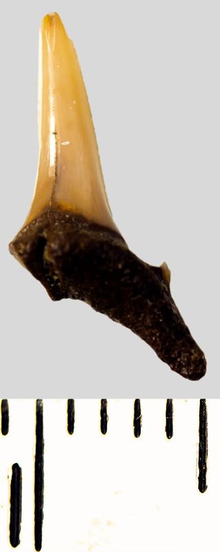 Мелкий боковой зуб с коронкой рыжевато-бежевого цвета, колюще-режущего типа, S-образно изогнутой, с гладким режущим краем. С лингвальной стороны у основания коронки на эмали имеется скульптура в виде слабой продольной струйчатости. Корень бурый, арочный, умеренно массивный, со следами окатанности, левая ветвь утрачена. Имеется одна питательная борозда с лингвальной стороны корня. Добавочные зубцы коронки зуба отсутствуют.