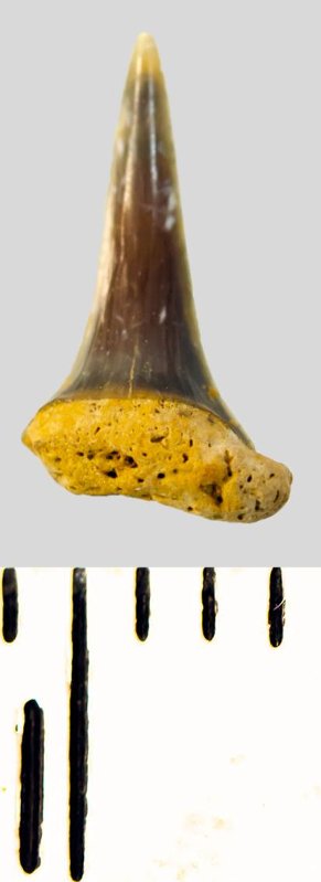 Мелкий боковой зуб с коронкой рыжевато-бежевого цвета, колюще-режущего типа, S-образно изогнутой, с гладким режущим краем. С лингвальной стороны у основания коронки на эмали имеется скульптура в виде слабой продольной струйчатости. Корень бурый, арочный, умеренно массивный, со следами окатанности, левая ветвь утрачена. Имеется одна питательная борозда с лингвальной стороны корня. Добавочные зубцы коронки зуба отсутствуют.