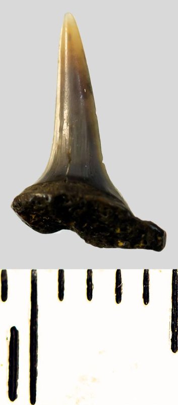 Мелкий боковой зуб с коронкой рыжевато-бежевого цвета, колюще-режущего типа, S-образно изогнутой, с гладким режущим краем. С лингвальной стороны у основания коронки на эмали имеется скульптура в виде слабой продольной струйчатости. Корень бурый, арочный, умеренно массивный, со следами окатанности, левая ветвь утрачена. Имеется одна питательная борозда с лингвальной стороны корня. Добавочные зубцы коронки зуба отсутствуют.