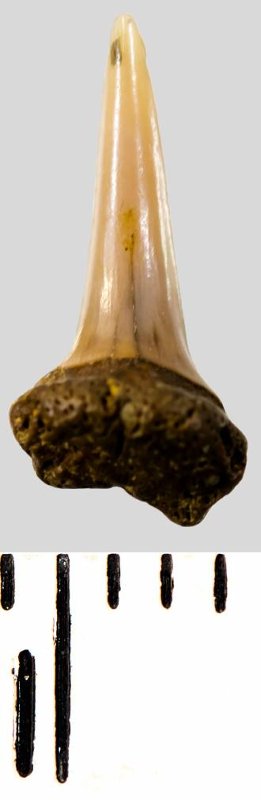 Зуб. Акула. Eostriatolamia subulata (Agassiz, 1843). Классификация: Хордовые Chordata, Позвоночные Vertebrata, Хрящевые рыбы Chondrichthyes, Пластиножаберные Elasmobranchii, Акулы Selachii, Ламнообразные Lamniformes, Песчаные акулы Odontaspididae