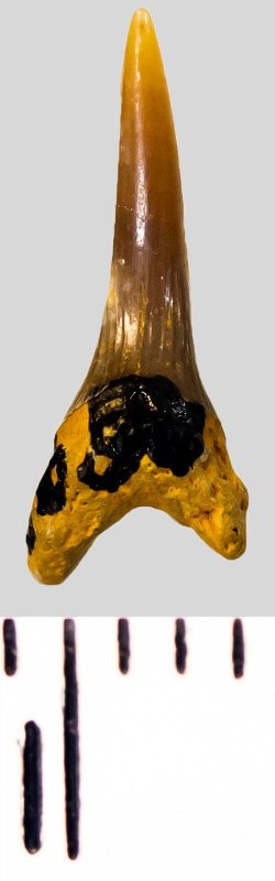 Зуб. Акула. Scapanorhynchus sp. Классификация: Хордовые Chordata, Позвоночные Vertebrata, Хрящевые рыбы Chondrichthyes, Пластиножаберные Elasmobranchii, Акулы Selachii, Ламнообразные Lamniformes