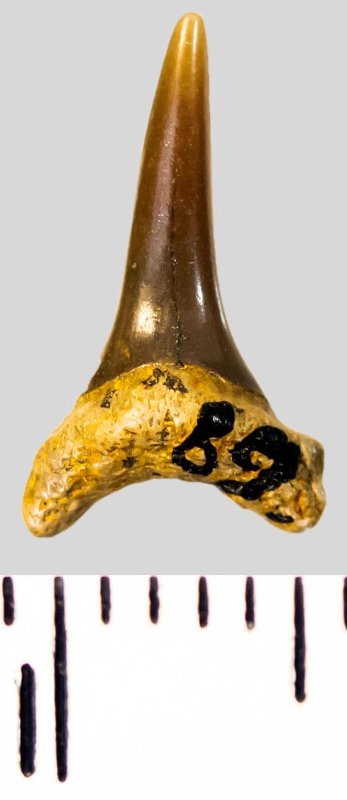Мелкий боковой зуб с коронкой бурого цвета, режущего типа, S-образно изогнутой, с гладким режущим краем. Корень охристый, арочный, умеренно массивный, со следами сильной окатанности. Добавочные зубцы коронки не сохранились.