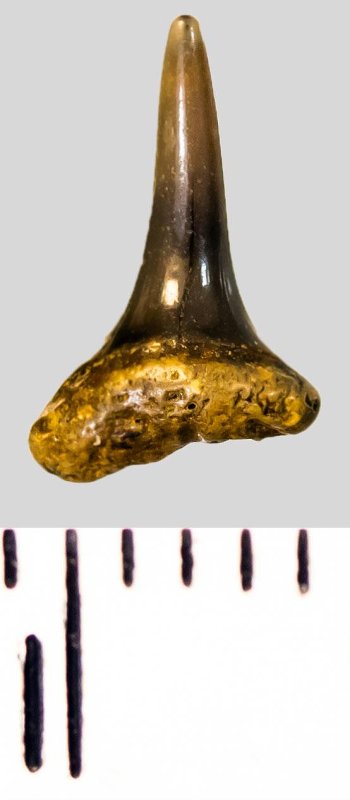 Мелкий боковой зуб с коронкой серо-бурого цвета, режущего типа, S-образно изогнутой, с гладким режущим краем. Корень темно-охристый, арочный, умеренно массивный, со следами сильной окатанности. Добавочные зубцы коронки не сохранились.
