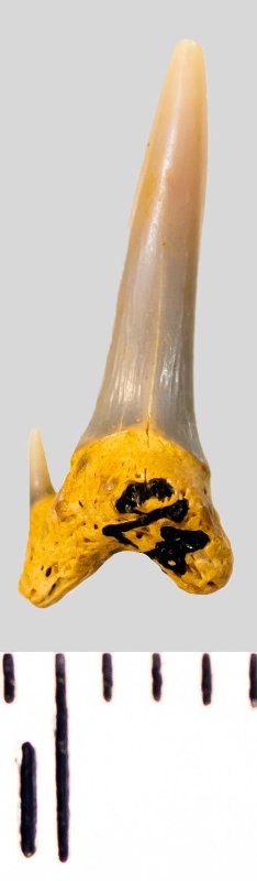 Зуб. Акула. Scapanorhynchus sp. Классификация: Хордовые Chordata, Позвоночные Vertebrata, Хрящевые рыбы Chondrichthyes, Пластиножаберные Elasmobranchii, Акулы Selachii, Ламнообразные Lamniformes
