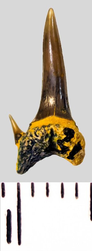 Мелкий боковой зуб с коронкой бурого цвета, колюще-режущего типа, S-образно изогнутой, с гладким режущим краем. С лингвальной стороны у основания коронки на эмали имеется скульптура в виде слабой продольной струйчатости. Корень грязно-охристый, арочный, умеренно массивный, со следами окатанности. С лингвальной стороны корня питательная борозда. Имелась одна пара добавочных зубцов коронки, сохранился только левый.