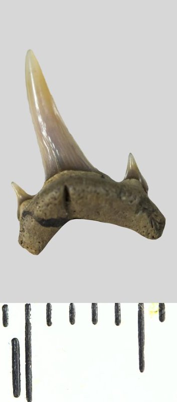 Зуб. Акула. Eostriatolamia sp. Классификация: Хордовые Chordata, Позвоночные Vertebrata, Хрящевые рыбы Chondrichthyes, Пластиножаберные Elasmobranchii