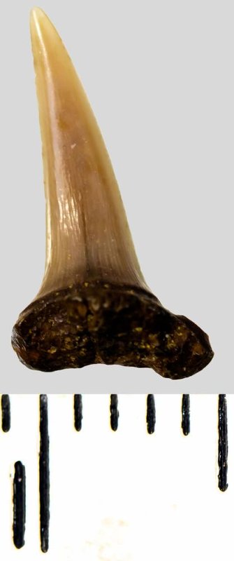 Зуб. Акула. Eostriatolamia subulata (Agassiz, 1843). Классификация: Хордовые Chordata, Позвоночные Vertebrata, Хрящевые рыбы Chondrichthyes, Пластиножаберные Elasmobranchii, Акулы Selachii, Ламнообразные Lamniformes, Песчаные акулы Odontaspididae