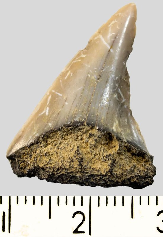Зуб. Акула. Otodus subserratus (Agassiz, 1843). Классификация: Хордовые Chordata, Позвоночные Vertebrata, Хрящевые рыбы Chondrichthyes, Пластиножаберные Elasmobranchii