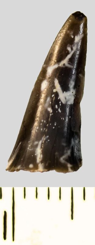 Зуб (фрагмент). Акула. Striatolamia elegans (Agassiz, 1838). Классификация: Хордовые Chordata, Позвоночные Vertebrata, Хрящевые рыбы Chondrichthyes, Пластиножаберные Elasmobranchii