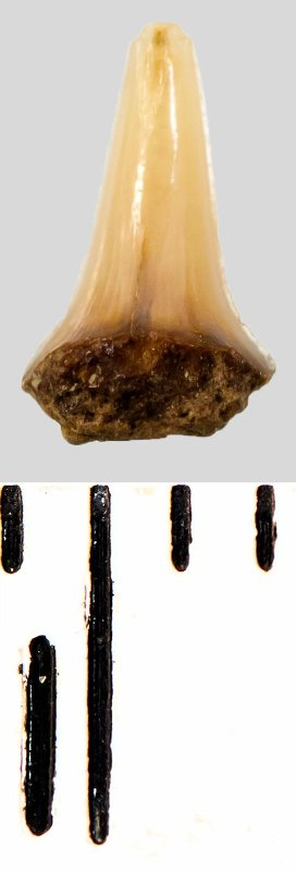Зуб. Акула. Eostriatolamia subulata (Agassiz, 1843). Классификация: Хордовые Chordata, Позвоночные Vertebrata, Хрящевые рыбы Chondrichthyes, Пластиножаберные Elasmobranchii, Акулы Selachii, Ламнообразные Lamniformes, Песчаные акулы Odontaspididae