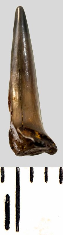 Зуб. Акула. Eostriatolamia subulata (Agassiz, 1843). Классификация: Хордовые Chordata, Позвоночные Vertebrata, Хрящевые рыбы Chondrichthyes, Пластиножаберные Elasmobranchii, Акулы Selachii, Ламнообразные Lamniformes, Песчаные акулы Odontaspididae