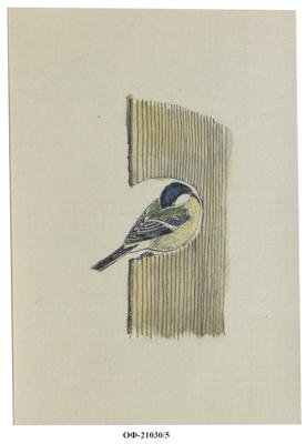 Большая синица на ночь забралась в выдолбленное в сухом стволе дятлом дупло. Рисунок