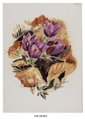 На открытке вертикального формата на фоне пожухлой листвы изображены цветы прострела.