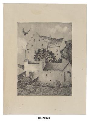 На листе вертикального формата изображен замок Розенбург (Риденбург) со стороны внутренних ворот. Ворота на первом плане, за ними стены и крыши замка. Перед фасадом замка с характерным ступенчатым фронтоном изображено дерево с раскидистой кроной. В верхнем левом углу изображена парящая хищная птица.