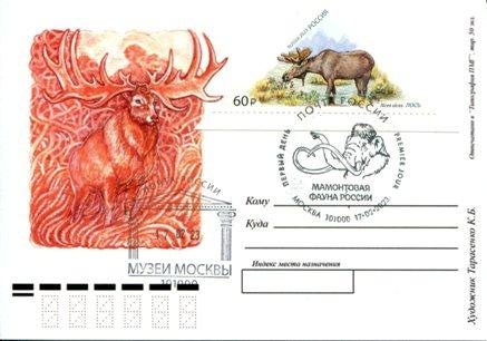 На открытке слева изображен красный большерогий олень (Художник – Тарасенко К.Б.), справа место для адреса. В верхнем правом углу марка с изображением лося и номиналом 60 руб. (Художник – Салтыкова А.-М. Оформление – Савина О.). Животное подписано на русском и дано латинское название. На конверте штампа гашения с изображением головы мамонта (Художник – Егиазарян А.) и штамп гашения музеев Москвы.