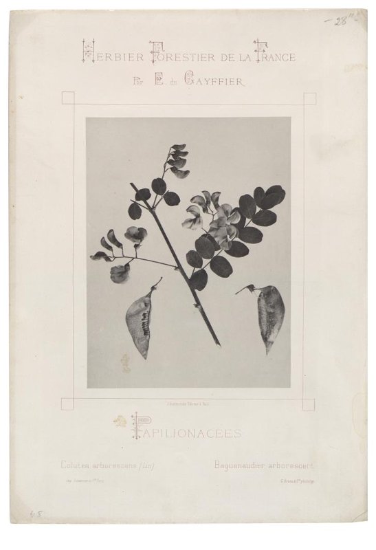 На листе вертикального формата в тонкой рамке фотографическое изображение цветущей ветки пузырника. Под изображением название на латинском и французском языках.