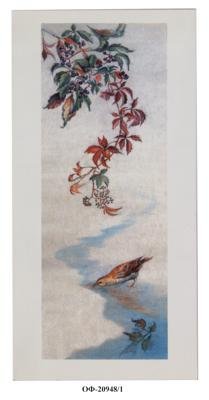 На открытке вертикального формата изображена птица у ручья, над ней свисает побег дикого винограда с черными ягодами, красными и зелеными листьями.
