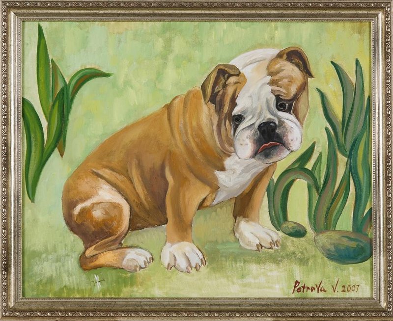 Английский бульдог. Камерный живописный портрет английского бульдога в золочёной раме, украшенной растительным орнаментом. Собака представлена сидя в статичной позе. Окрас традиционный для этой породы: рыже-белый. Изображена в полупрофиль. Опирается на все четыре конечности. Верхняя часть туловища приподнята над землёй. Голова наклонена влево. Чёрный нос, фиалковые глаза, виден кончик серовато-розового языка Фигура бульдога представлена крупным планом, она занимает всю центральную часть полотна. Справа и слева - стилизованные ланцетовидные листья густо-зелёного цвета. Справа эти листья изобра растущими из зелёных луковиц. Вся композиция по цветовой гамме гармонирует с общим салатовым фоном. Ощущение, что бульдог чем-то опечален. Он задумчив и доброжелателен. Внизу слева возле правой задней конечности изображено мелкое насекомое, что-то вроде комара. Это придаёт некий шарм произведению, в тоже время выполняет роль "последнего штриха". Это изображение бульдога явно тяготеет к портретному жанру. Художница не ставила задачу зафиксировать представителя этой породы во всех подробностях, она избегала детализации, создав при этом очаровательный образ изнеженного и трогательного существа.