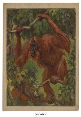 Открытка вертикального формата с белыми полями. На фоне тропической растительности крупно изображен оранг в ветвях, внизу слева два крупных плода. На обороте место для адреса и для сообщения. Вверху логотип «ГИЗ».
