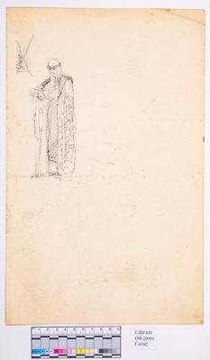 В верхней левой части вертикального листа - зарисовка стоящей женщины в древнерусской одежде.
