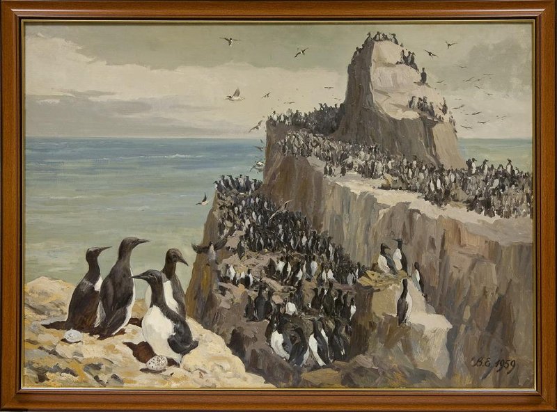 На картине горизонтального формата изображена колония кайр на прибрежных скалах. Основная колористическая гамма полотна холодная. На первом плане слева изображены четыре взрослые кайры, сидящие на скальном уступе. Окраска всех птиц одинаковая: черные голова, шея и спина, белые грудь и живот. Рядом с кайрами на скале лежат два пятнистых яйца. Одна пара птиц изображена анфас, а вторая сидит, повернувшись направо – туда, где на втором плане поднимается высокая трехступенчатая скала. На ее широких уступах размещается многочисленная колония кайр. Вблизи еще можно различить очертания отдельных птиц, вдали они превращаются в сплошную черно-белую массу. В воздухе вокруг этой серой скалы парит множество птиц, а за ней открывается вид на спокойное голубовато-серое море. Верхнюю треть полотна занимает изображение серого неба, покрытого облаками. Краски наложены плотно, пастозно, фактура мазка хорошо видна.