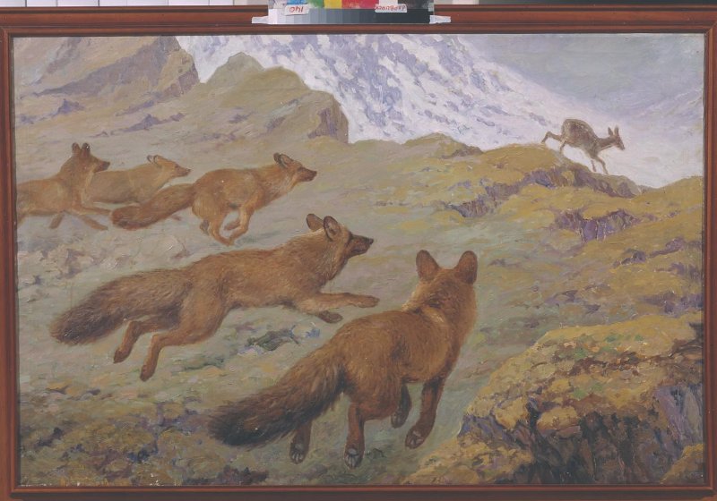 Картина горизонтального формата, основная колористическая гамма теплая. Стая из пяти красных волков, преследует на горном склоне кабаргу. Погоня движется слева направо. На первом плане изображены в прыжке два красных волка, ноги их не касаются земли, видны темно-серые подушечки лап. Пушистые рыжие хвосты вытянуты параллельно земле. Слева на втором плане видны еще три бегущих красных волка. На третьем плане справа, на фоне далеких заснеженных горных вершин четко вырисовывается темный силуэт убегающей кабарги. Небо серое, туманное. Каменистая зеленовато-желтая земля написана мазками светло-зеленого, розового, голубого и фиолетового цвета. На первом плане справа лежит охристо-желтый каменный валун. Краски наложены густо, пастозно.