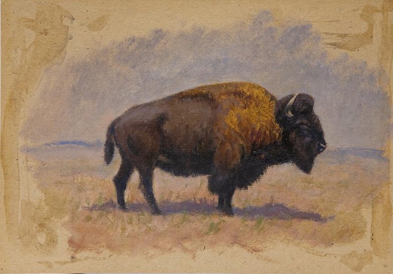 На картине горизонтального формата изображен в профиль, правым боком к зрителю, американский бизон прерий – самка. Окраска ее темно-коричневая, передняя часть тела и холка - рыжие. Передние ноги бизона поставлены рядом, а правая задняя - выставлена несколько вперед относительно левой, короткий хвост спокойно опущен. Животное изображено на фоне пейзажа прерии, до светло-голубого горизонта простирается розоватая земля, на которой обозначена легкими светло-зелеными мазками трава. Небо светло-голубое, чуть фиолетового оттенка. Изображение находится в центре листа картона, поля оставлены не загрунтованными и не закрашенными. Краски наложены плотно, фактура мазка хорошо видна.
