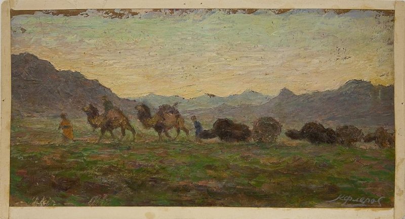 На листе горизонтального формата изображен пейзаж с идущим справа налево караваном на фоне гор. Впереди каравана идёт человек в желтом халате, подпоясанном синим кушаком. За ним друг за другом идут два верблюда, первый везёт всадника в тёмно-зелёном халате и бежевом головном уборе, за вторым верблюдом идёт человек в синем одеянии. За ним друг за другом движутся коричневые яки, запряженные в повозки. Небо палево-зеленовато-бирюзовое. Земля написана травянисто-зелёными, оливковыми и коричневыми мазками.