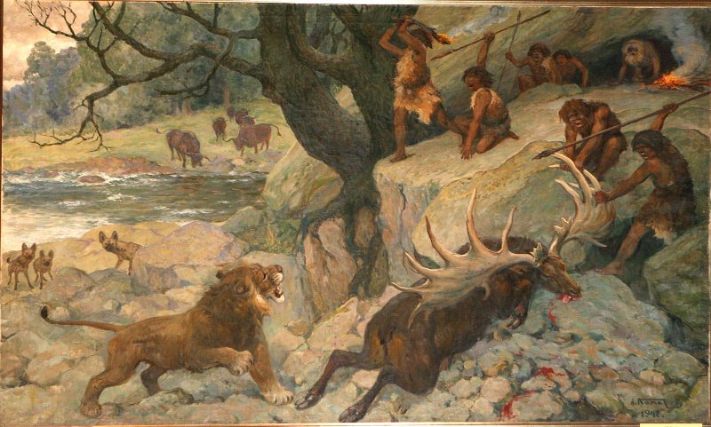 На картине горизонтального формата изображена группа первобытных людей, пытающаяся отогнать пещерного льва от своей добычи – большерогого оленя. На первом плане справа на брюхе лежит убитый темно-бурый большерогий олень. Из его окровавленной пасти свешивается розовый язык. Оленя за его левый большой рог тянут два человека, пытаясь подтащить его поближе к входу в пещеру, расположенную справа. На камнях внизу виден кровавый след, оставленный тушей животного. Слева к оленю подходит пещерный лев с короткой светлой гривой. Его правая передняя лапа приподнята, хвост с кисточкой на конце вытянут параллельно земле. Голова льва изображена в профиль: уши прижаты, пасть раскрыта в грозном рыке, взгляд устремлен вверх и направо – к площадке у входа в пещеру. Там на скальном выступе находятся четыре человека, пытающиеся защитить свою добычу. Двое из них потрясают над головами копьями с каменными наконечниками, а один собирается метнуть в хищника горящий факел. За ними на втором плане у входа в пещеру видны еще три человека: двое молодых, один из которых вооружен копьем, и седой старик с бородой, сидящий возле костра. Все люди одеты в звериные шкуры, волосы их спутаны, тела смуглые. В центре композиции на краю скального выступа растут два мощных дерева с корнями, оплетающими камни. На втором плане слева за ходом схватки из-за камней наблюдают три гиеновые собаки. За ними виднеется узкая река, на противоположном берегу которой на водопой идут шесть темных туров. Вдали голубеет обобщенно написанный лес. Краски наложены плотно.