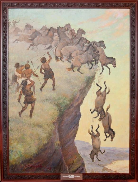 Картина вертикального формата, основная колористическая гамма теплая. Изображены первобытные люди во время загонной охоты на диких лошадей. На первом плане слева группа из пяти человек, одетых в шкуры и вооруженных копьями и каменными топорами, гонит к обрыву табун диких лошадей. Все животные окрашены одинаково: они коричневато-серые, с короткими гривами. Справа три лошади уже летят в пропасть вниз головой. С края обрыва, где в страхе сбились в кучу остальные кони, сыпется земля. На втором плане слева сквозь пыль, поднятую лошадьми, видны еще два человека, а в сторону коней в воздухе летит несколько копий. Утес порос желтовато-зеленой травой. Справа внизу расположен сиреневый берег водоема. Линия горизонта расположена низко, небо над ней желтое, а вверху, где плывут легкие оранжево-розовые облака, становится зеленовато-голубым. Краски наложены тонко, плотно.